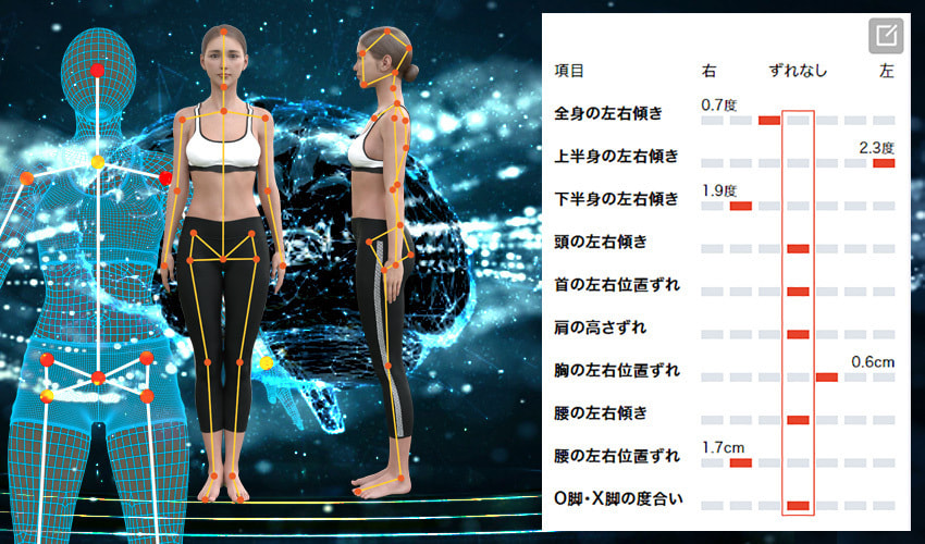 AI技術により骨格座標から、身体の歪み筋肉の状態を可視化する事が可能。