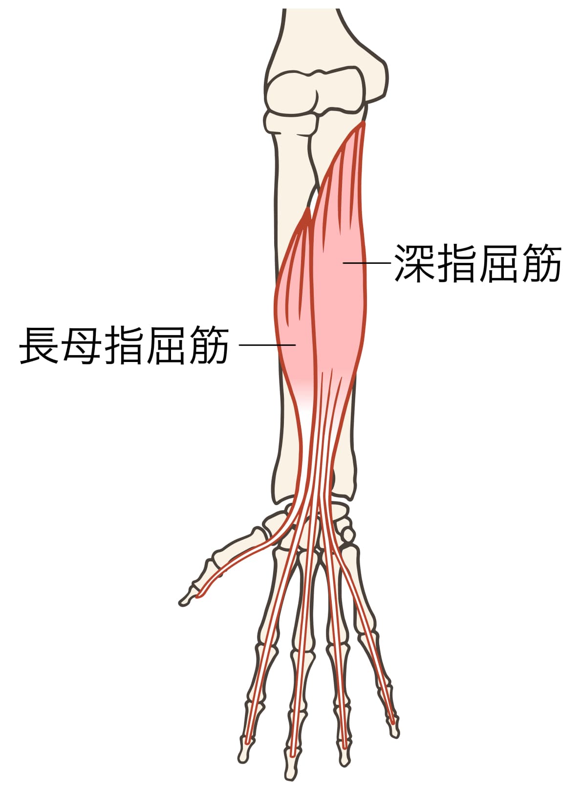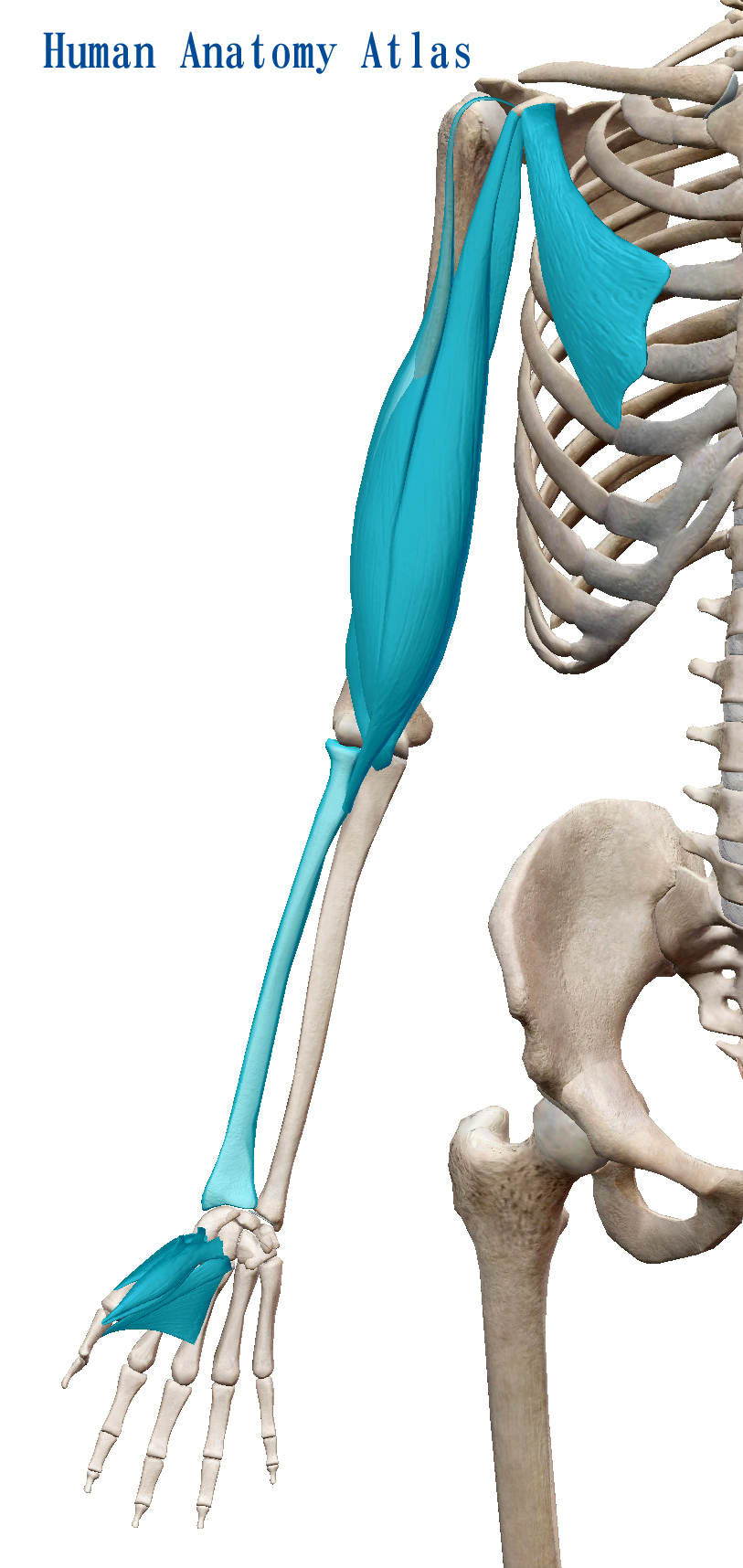 親指の筋肉は、手首を通って肘の手前まで延びています。