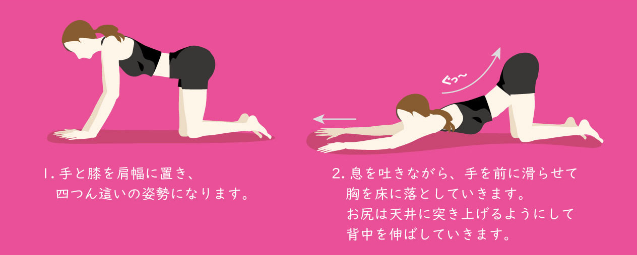 ヨガの「猫の伸びのポーズ」で背骨を反らしていくことで、丸くなった背中を改善していきます。