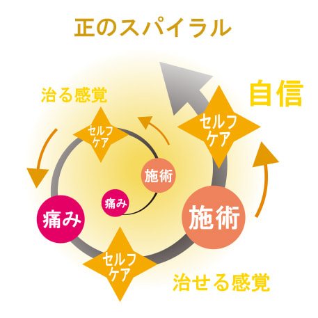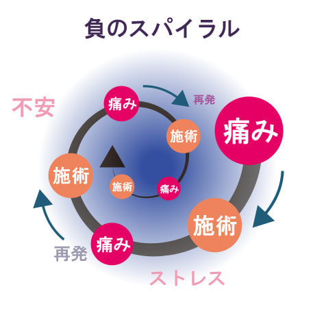 すると、「また治療に行かなくては…」、「自分では治せない…」と、余計に不安やストレスを抱え、治っているという実感が感じられないまま、痛みを繰り返す負のスパイラルへと向かって行ってしまいます。